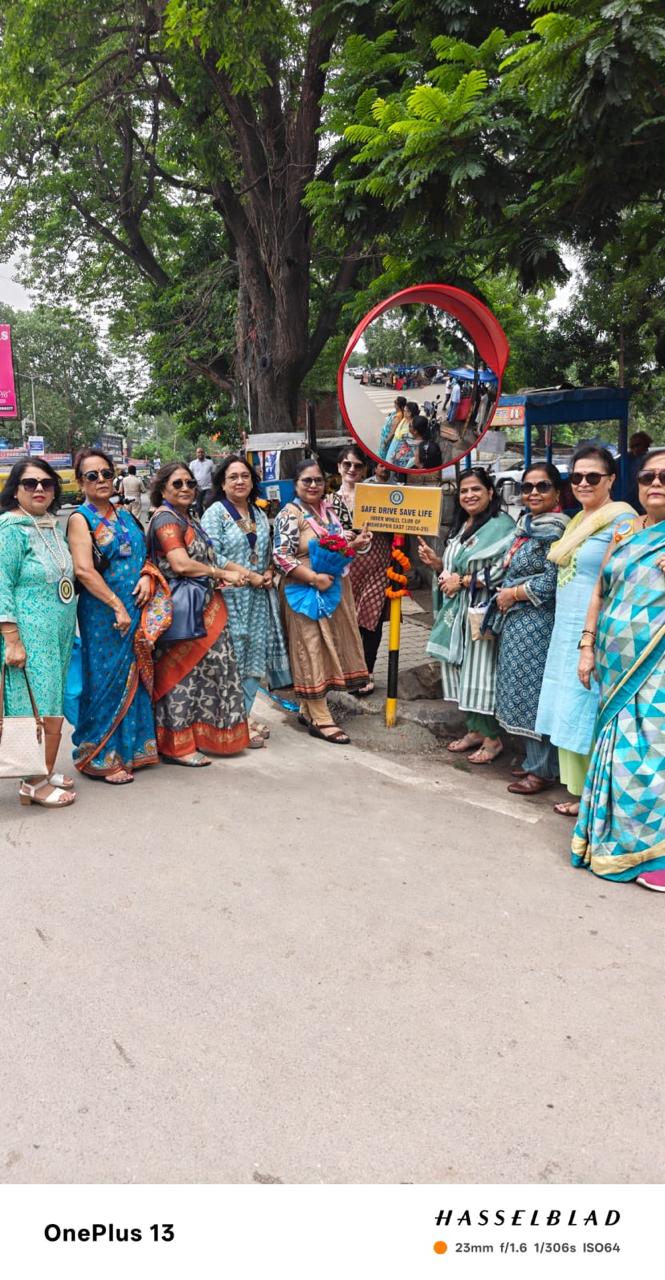 Inner Wheel Club of Jamshedpur East installed a road safety convex mirror at Sakchi Roundabout to enhance traffic visibility. District Chairman Alaknanda Bakshi inaugurated the safety initiative.