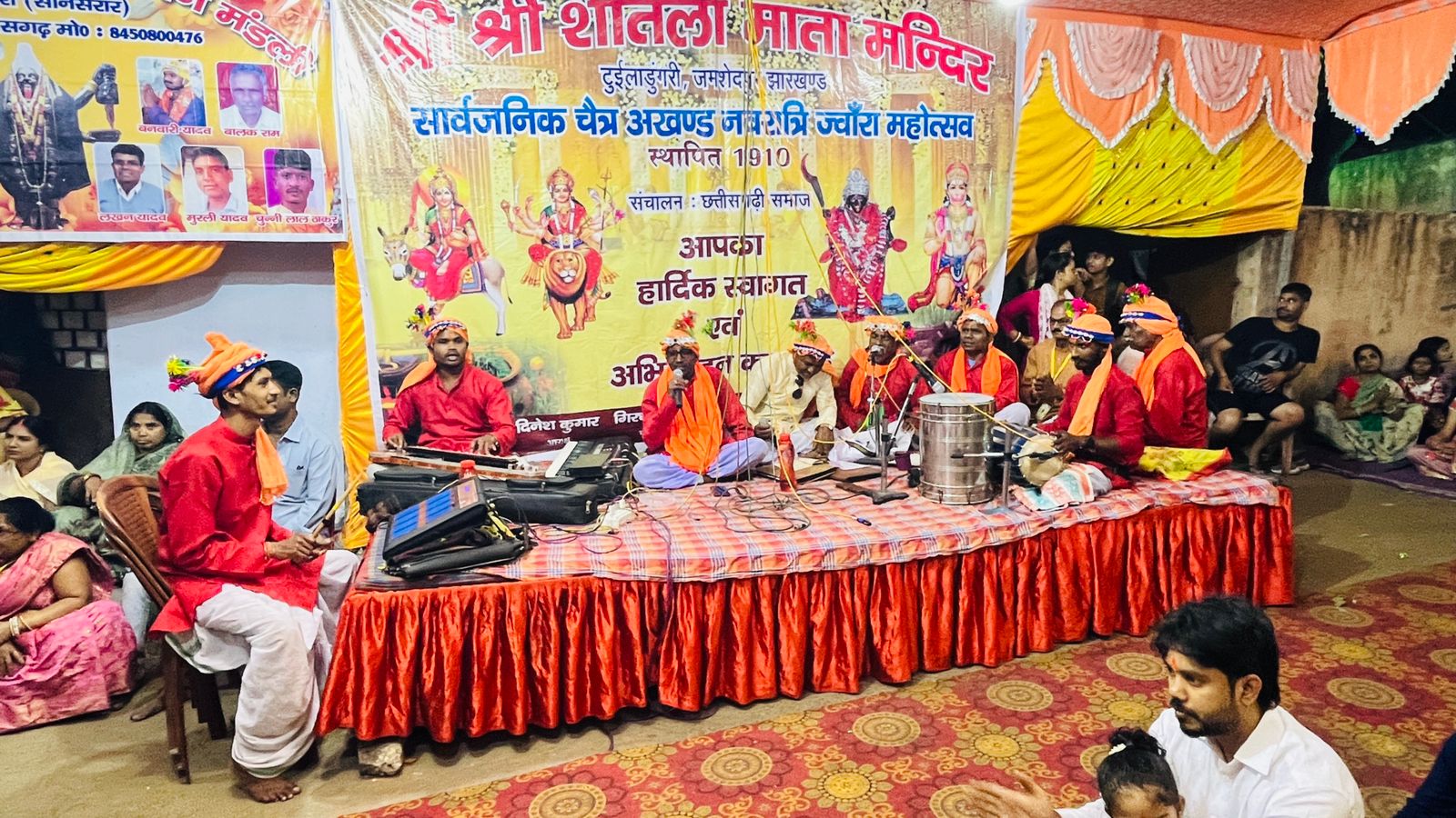 जमशेदपुर : श्री श्री शीतला माता मंदिर, टुइलाडुंगरी में चल रहे चैत्र नवरात्रि ज्वारा महोत्सव में छत्तीसगढ़ से आए जश गायन मंडली पूरे जमशेदपुर शहर में धूम मचा रही है, जय मां कालिका सेवा भजन मंडली, ग्राम सुखरी राजनांदगांव से पधारे जश गायन मंडली का नेतृत्व बनवारी यादव (मुख्य गायक), हरि राम साहू (मुख्य कोरस), बालक राम (कोरस), हुकुम निषाद (मंजीरा), लखन लाल यादव (झांझ), विजय यादव (बैंजो एवं आर्गन), डिगेश्वर साहू (नाल), चुन्नी लाल ठाकुर (ढोलक), वंश कुमार निषाद (झांझ) में अपनी सेवा प्रदान कर रहे है, छत्तीसगढ़ समाज द्वारा आयोजित होने वाले चैत्र नवरात्रि ज्वारा महोत्सव की परम्परा है की नौ दिनों तक चलने वाली इस पूजा में प्रत्येक दिन संध्या आरती समाप्ति के पश्चात माता को प्रसन्न करने के जश गीत और देवता पार गीत गाए जाते है जिस से माता प्रसन्न हो कर विभिन्न पूजा पाठ करने वाले लोग जिनके पूर्वजों के द्वारा अपने घरों में माता को स्थान दिया गया है वैसे परिवार के लोगो के महिला और पुरुष, युवक युवती पर माता का वास हो जाता है और माता की भक्ति में वो लोग रम जाते है।