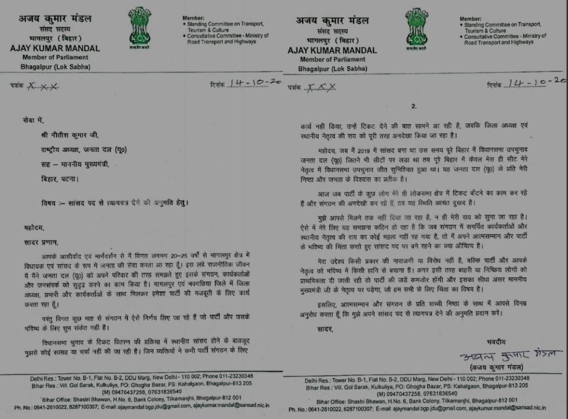 जेडीयू सांसद अजय कुमार मंडल ने सांसद पद से त्यागपत्र की अनुमति मांगी, पार्टी में स्थानीय नेतृत्व की अनदेखी का जताया रोष October 14, 2025 No Comments