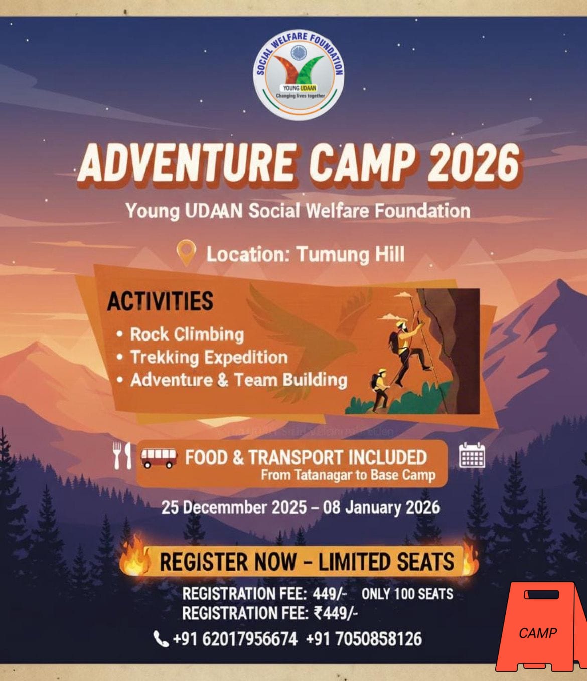 YOUNG UDAAN SOCIAL WELFARE FOUNDATION ONE ADVENTURE CAMP मानसिक व शारीरिक सशक्तिकरण की अनोखी पहल यंग उड़ान सोशल वेलफेयर फाउंडेशन का एकदिवसीय भव्य एडवेंचर शिविर December 28, 2025 No Comments