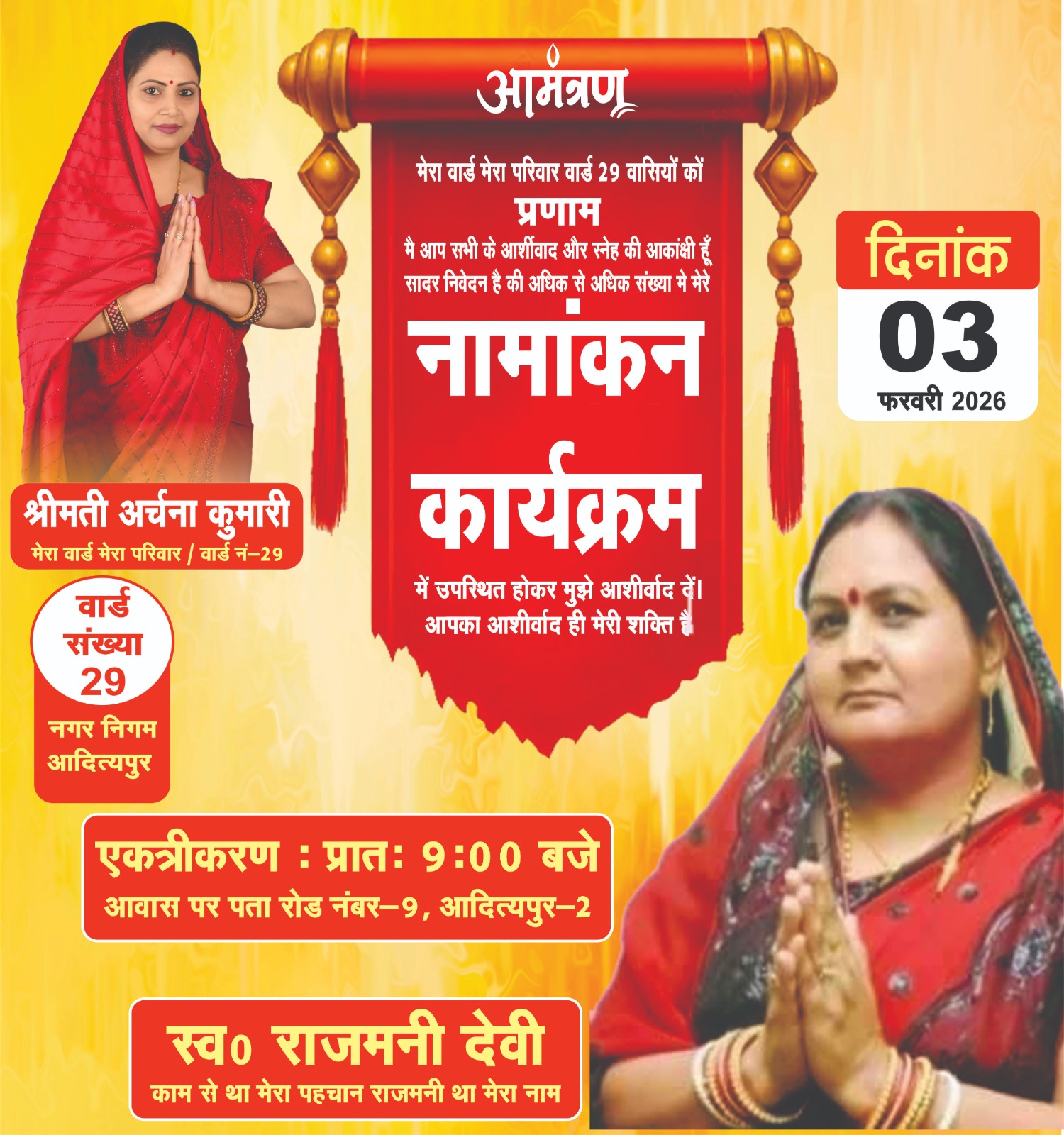 Ward 29 Aditypur Municipal Election सास के अधूरे सपनों को साकार करने चुनावी रण में उतरीं बहु अर्चना सिंह, वार्ड 29 से दाखिल किया नामांकन February 3, 2026 No Comments
