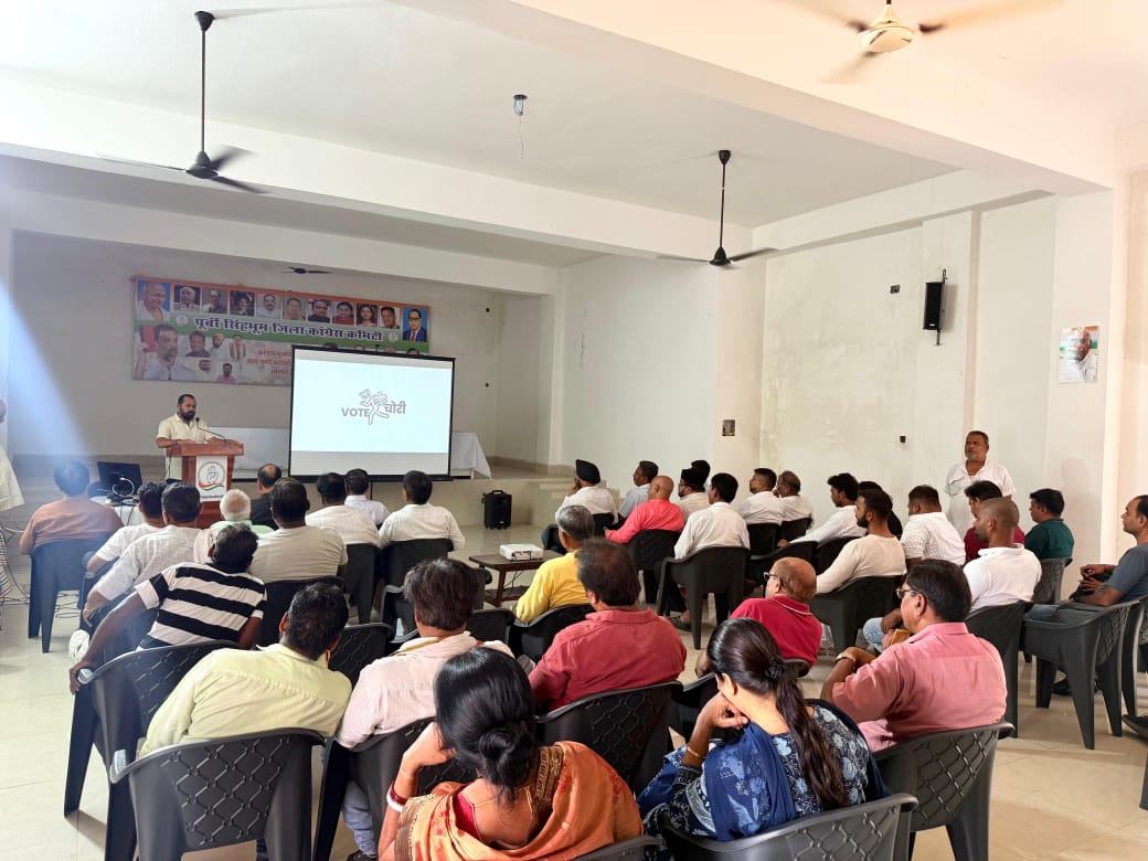 Jamshedpur : अखिल भारतीय कांग्रेस कमिटी और झारखंड प्रदेश कांग्रेस कमिटी के आह्वान पर पूर्वी सिंहभूम जिला कांग्रेस कमिटी ने “वोट की चोरी” विषय पर कांग्रेस नेता राहुल गांधी का प्रेजेंटेशन प्रोजेक्टर के माध्यम से देखा।