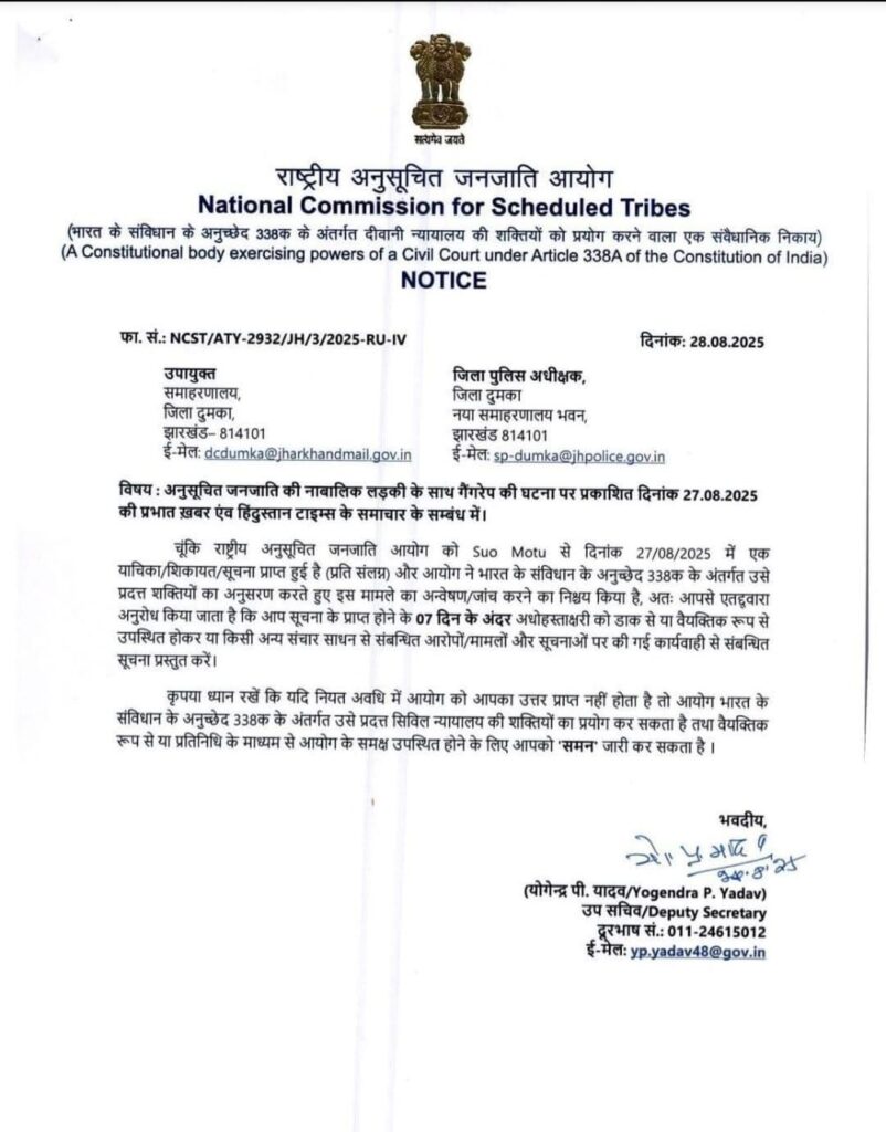 दुमका (झारखंड): दुमका जिले के काठीकुंड प्रखंड में अनुसूचित जनजाति (पहाड़िया समुदाय) की एक नाबालिग किशोरी के साथ हुए सामूहिक दुष्कर्म के जघन्य मामले को राष्ट्रीय अनुसूचित जनजाति आयोग (एनसीएसटी) ने गंभीरता से लिया है। आयोग की सदस्य डॉ. आशा लकड़ा के निर्देश पर इस प्रकरण पर स्वत: संज्ञान लेते हुए कार्रवाई की गई है।