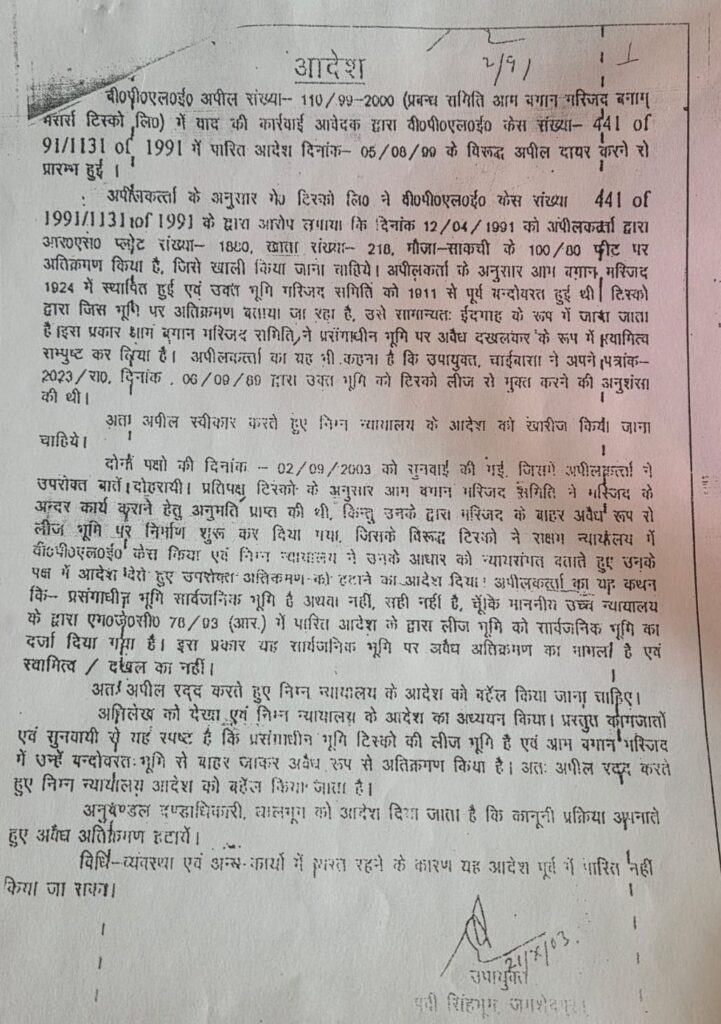 अधिवक्ता चंदन चौबे का कहना है कि आम बागान मैदान में मस्जिद कमेटी को 100×80 क्षेत्रफल का आवंटन है, लेकिन इसके बाहर टाटा लीज की जमीन पर कथित रूप से अवैध कब्जा कर दुकानें और अतिरिक्त निर्माण किए गए हैं। उन्होंने इसे प्रशासनिक निर्देशों और न्यायालय के आदेशों का स्पष्ट उल्लंघन बताया।